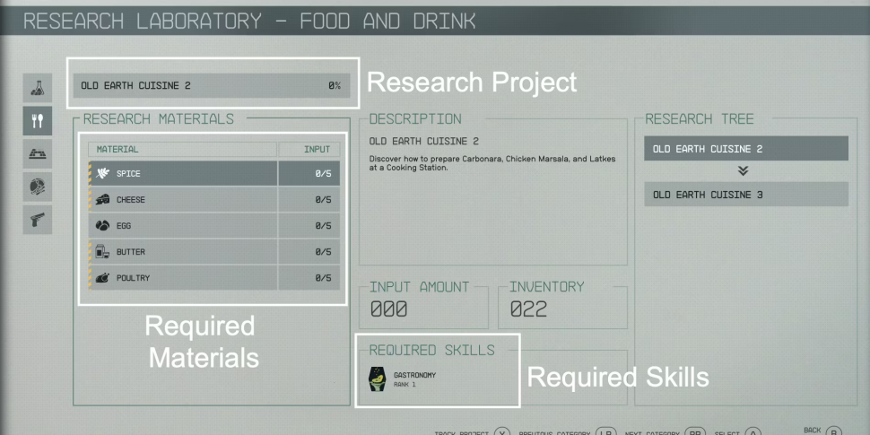 В разделе "Еда и напитки" при первом посещении игроком представлены три категории с двумя уровнями в каждой. Изучив имеющиеся данные, игрок увидит, какие рецепты он может разблокировать, какие ингредиенты для этого требуются, а также какие навыки необходимы для исследования того или иного уровня.