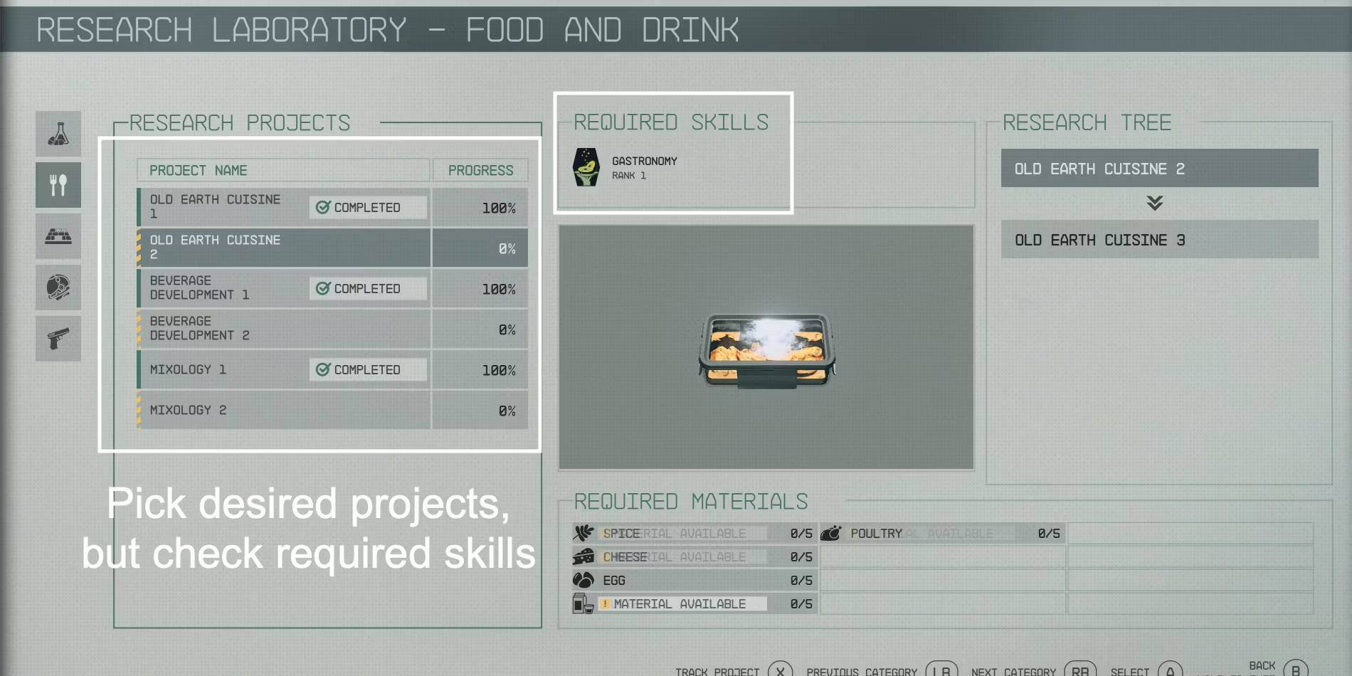 В разделе "Еда и напитки" при первом посещении игроком представлены три категории с двумя уровнями в каждой. Изучив имеющиеся данные, игрок увидит, какие рецепты он может разблокировать, какие ингредиенты для этого требуются, а также какие навыки необходимы для исследования того или иного уровня.
