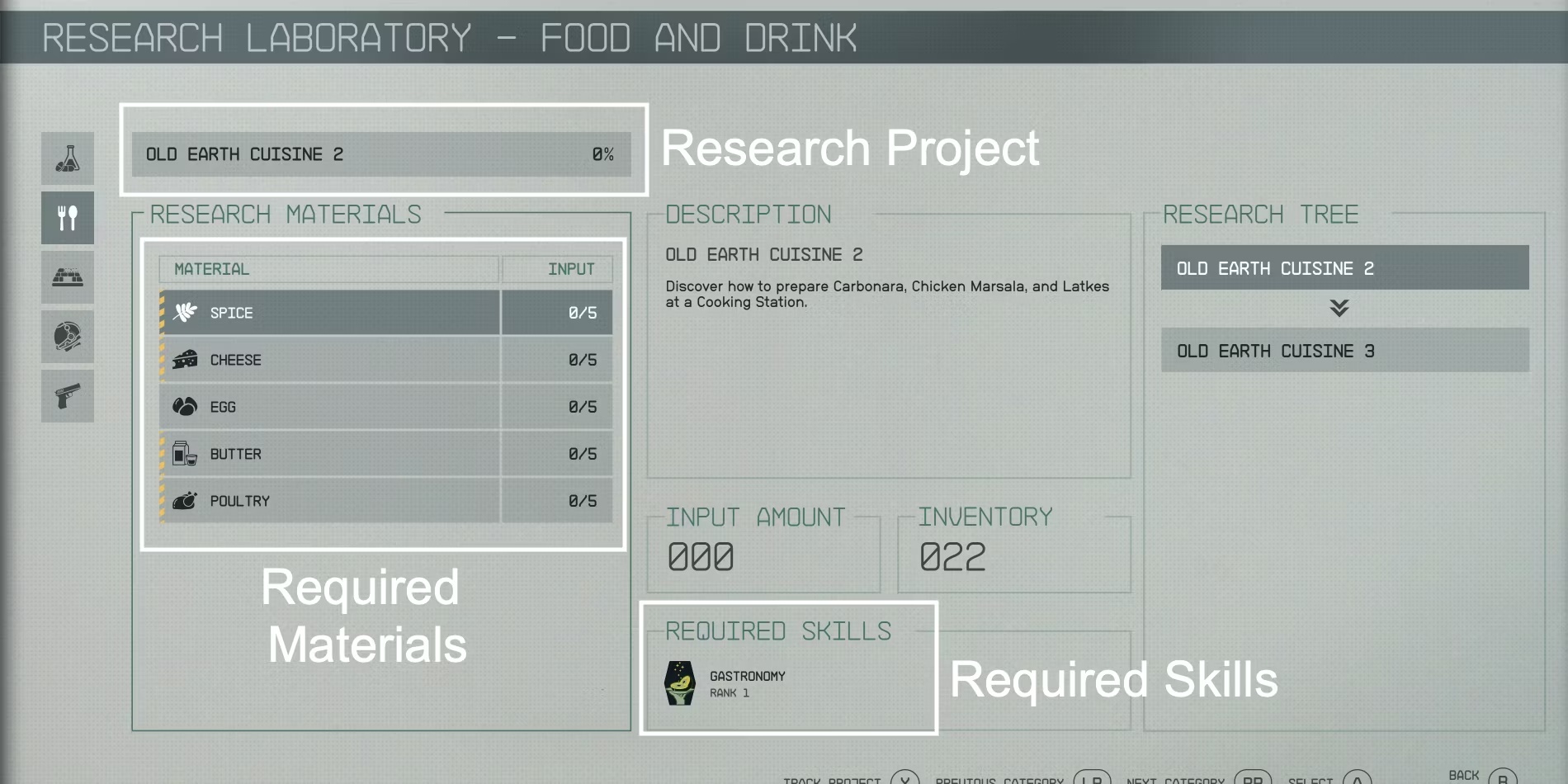 Исследования - это общий термин для всех работ, выполняемых на любой исследовательской станции в Звездном поле. На этой станции игроки вкладывают материалы в проекты, которые открывают возможность создания ремесел на различных станциях. В данном случае игроки хотят посетить раздел "Еда и напитки".