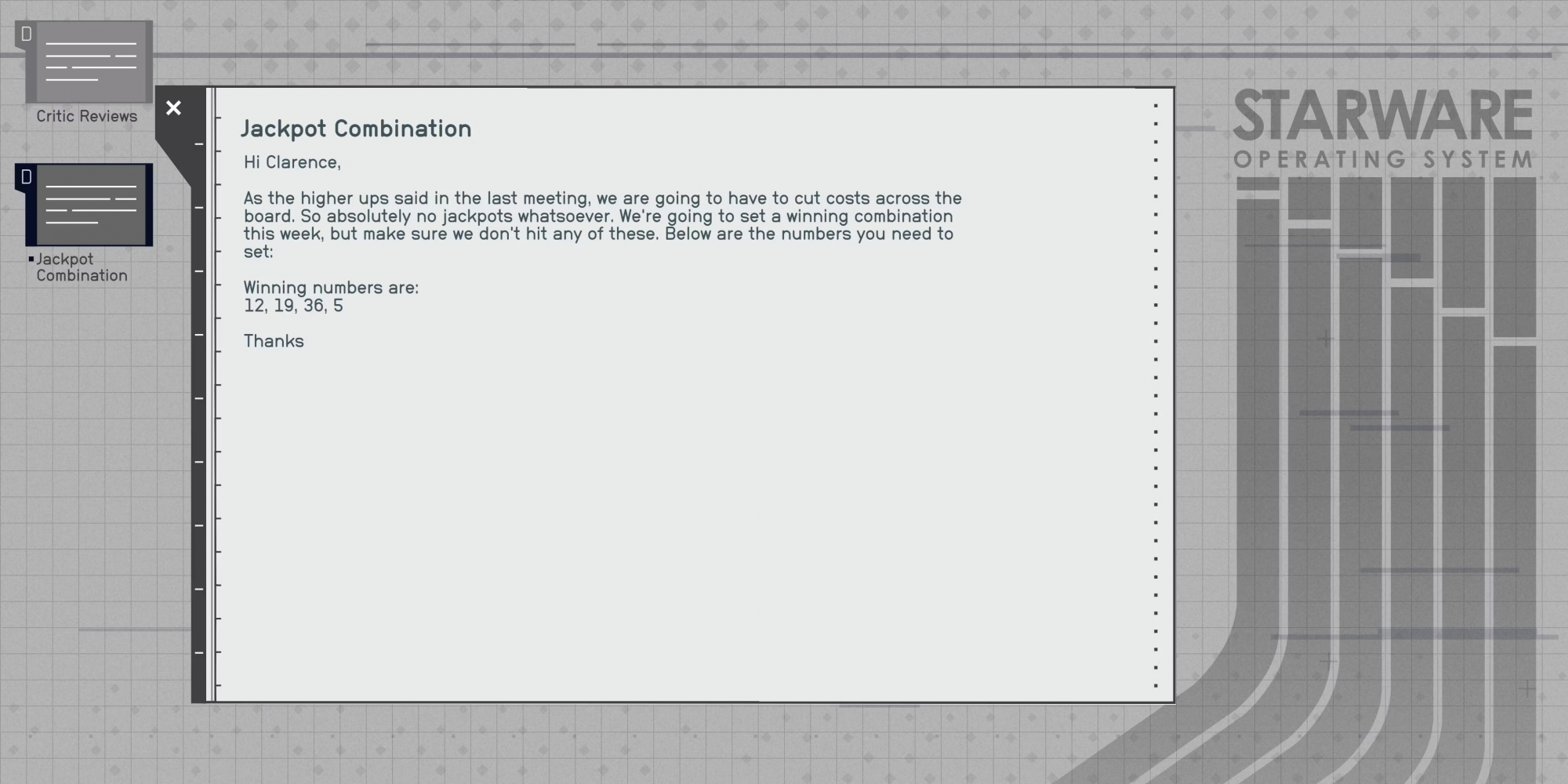 Выигрышными номерами для джекпота комбинации Almagest являются 12, 19, 36 и 5. Игроки могут узнать об этом, открыв файл Jackpot Combination на компьютере менеджера в боковой комнате с тремя встроенными в стену сейфами с возможностью взлома. В этой же комнате можно найти научный ящик, содержащий множество полезных предметов.