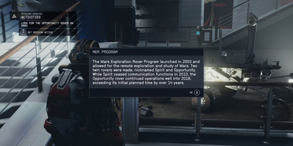 После осмотра экспозиции игроки получат уведомление о том, что поиск марсохода Opportunity на Марсе добавлен в их список заданий. Starfield не позволяет игрокам быстро перемещаться внутри зданий, поэтому им придется либо развернуться и отправиться обратно на улицу, либо продолжить выполнение задания. После этого можно будет открыть карту Марса и найти место посадки Opportunity Rover, которое появится к югу от Цидонии.