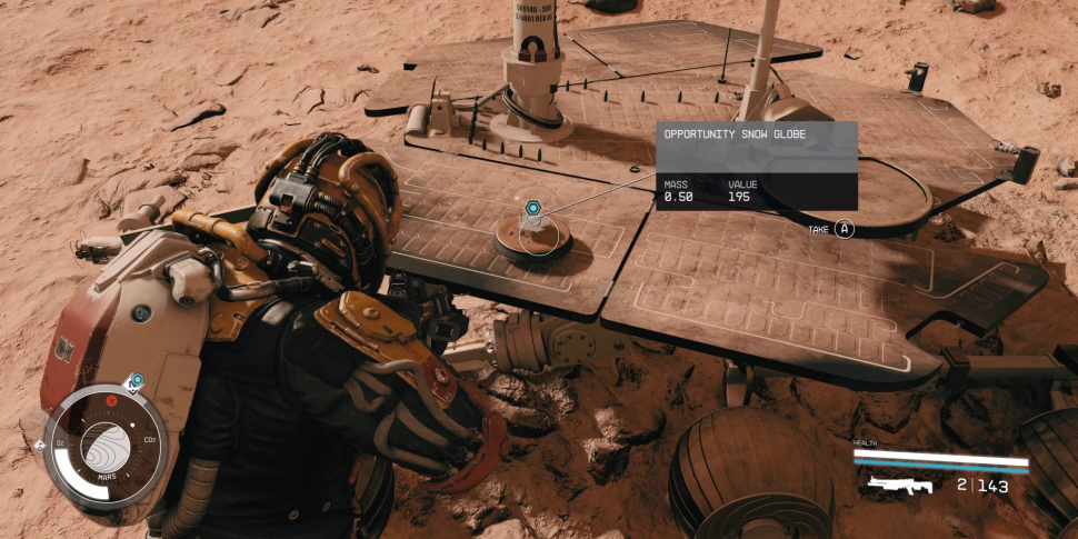 Приземлившись на поверхность планеты, игроки не найдут ничего особенного - только кучу камней, кратеров и сам марсоход Opportunity. На его вершине находится снежный шар Opportunity, который является одним из нескольких коллекционных предметов, которые игроки могут найти в Starfield. Найти их все не получится, но некоторые игроки наверняка будут гордиться этим.