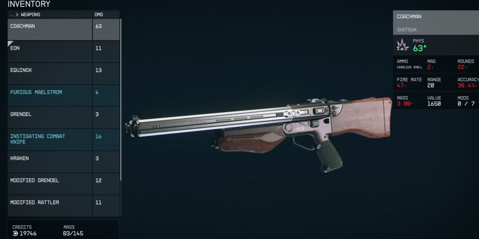 Первый дробовик, упомянутый в этом руководстве, - это обычная качественная версия Coachman. У него нет модов, точность 38,4%, объем магазина - два, а урон - 63. Для сравнения, Rapidshot редкого качества имеет шесть модификаций, точность 56,9%, объем магазина 6 патронов и наносит значительно больше урона, чем Coachman (131 урон, если быть точным).