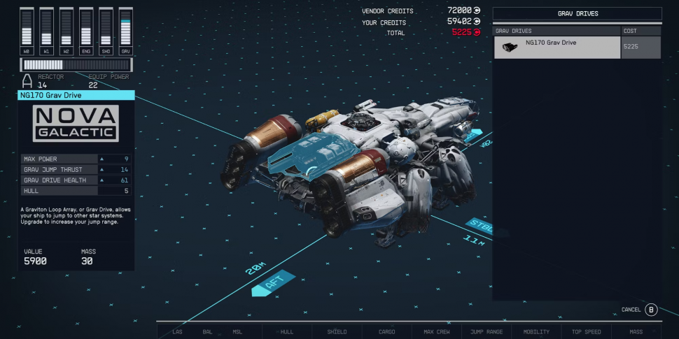 В разговоре с продавцом игрок может выбрать опцию "Я хотел бы посмотреть и изменить свои корабли", а затем выбрать принадлежащий ему корабль из списка. Затем нажмите кнопку A для выбора опции Upgrade Ship, чтобы увидеть все детали, которые можно модернизировать. Игрокам придется прокрутить страницу вправо, чтобы найти Grav Drives, и вы увидите список апгрейдов для него. Выберите ту, которая подходит для вашего корабля, если их несколько, и ваш корабль получит более совершенный гравипривод по более разумной цене.