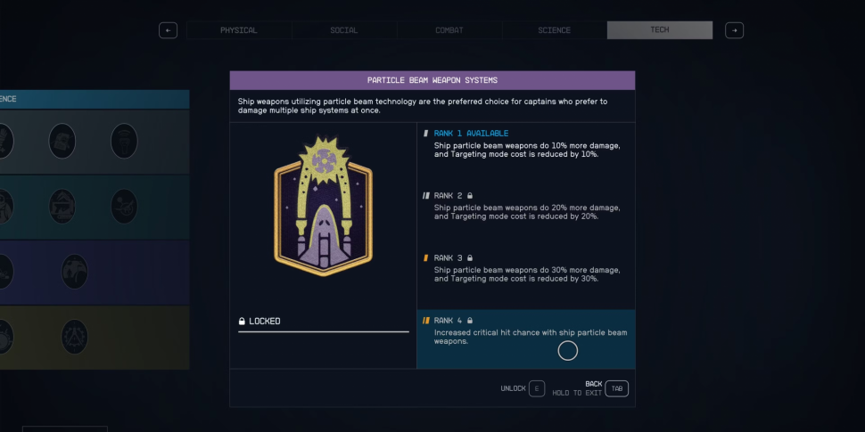 Этот навык в дереве технологий позволяет использовать лучевое оружие кораблей, увеличивая его урон на 10% и снижая его стоимость на 10%. Это очень полезно для тех, кто любит космические бои или хочет облегчить их. Если игрок доберется до 2-го ранга, то этот эффект увеличится на 20%, а на 3-м ранге - до 30%. Ранг 4 увеличит шанс критического попадания при использовании лучей частиц, выпущенных с кораблей, но это не обязательно. Помните, что это относится только к лучам частиц корабля, но не к оружию игрока.