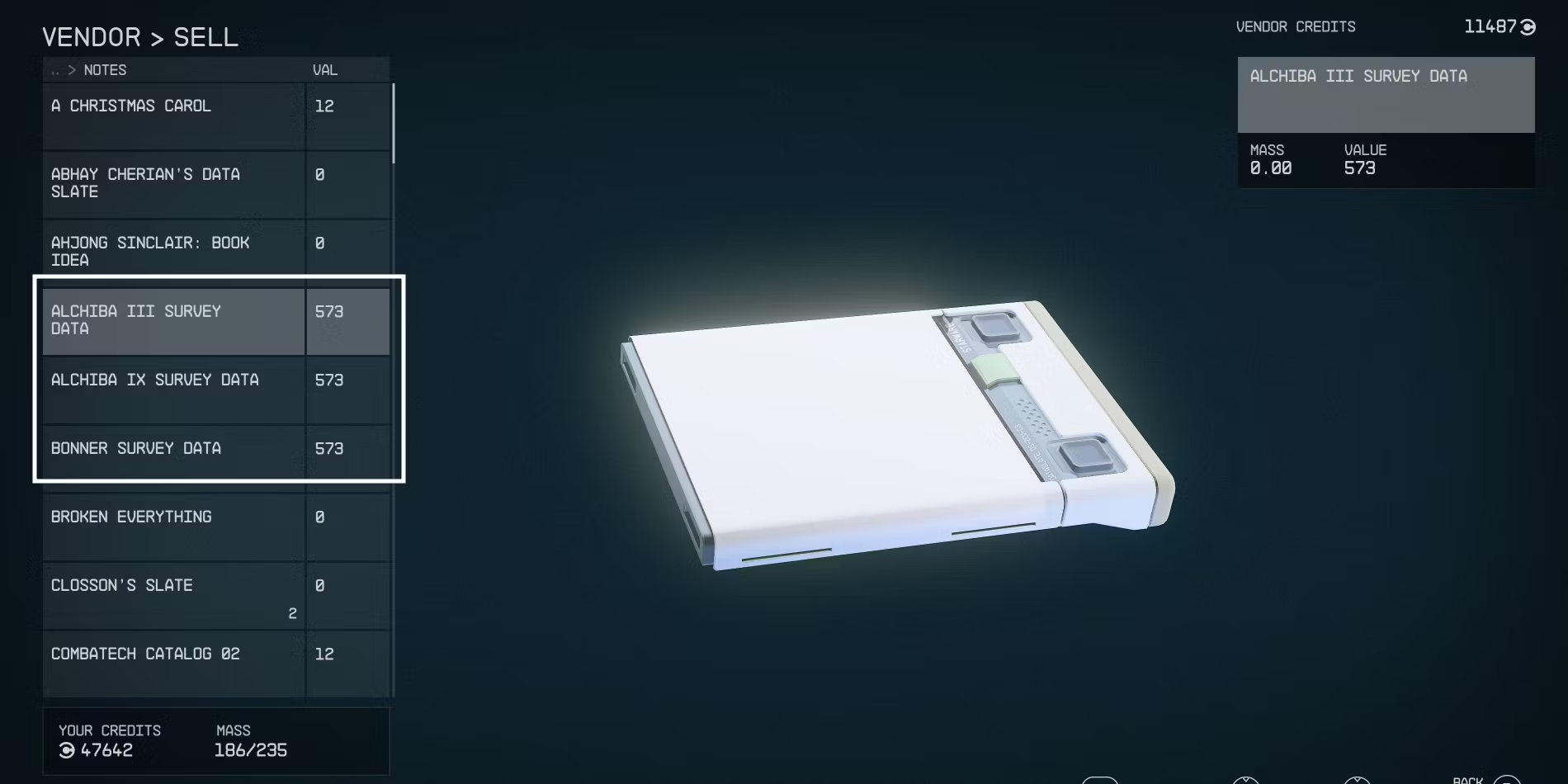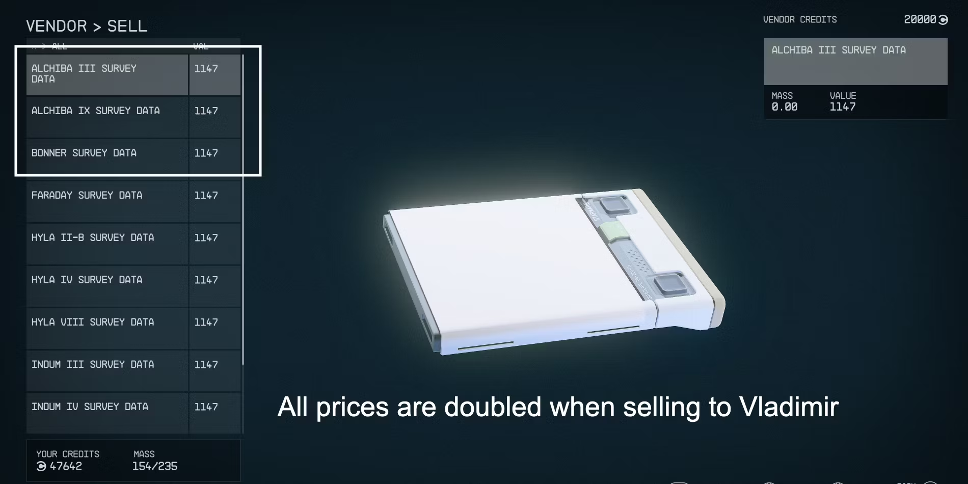 Survey Slates можно продать практически в любом месте, где есть торговая точка. Однако в большинстве таких мест цена будет не самой выгодной. Торговое управление даст 573 кредита за базовый лист исследования с планеты, на которой нечего исследовать. Дальше цены растут.