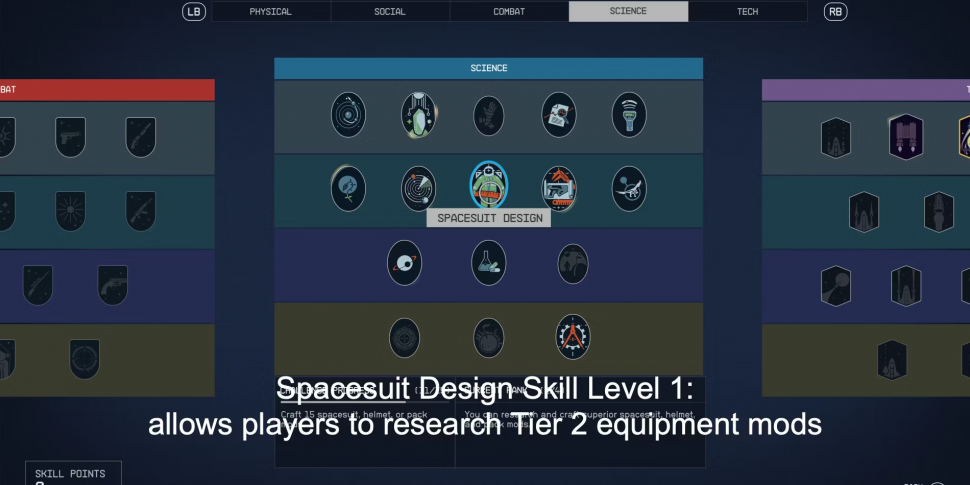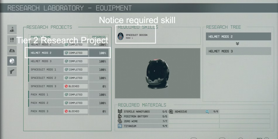 Когда игрок попытается начать исследовательский проект Helmet Mods 2, он заметит, что одним из ключевых требований является навык Spacesuit Design из дерева научных навыков Starfield. Это означает, что для разблокировки данного навыка игроку придется использовать очки навыков, которые приобретаются за очки опыта. Для некоторых проектов более высокого уровня потребуется даже несколько навыков.