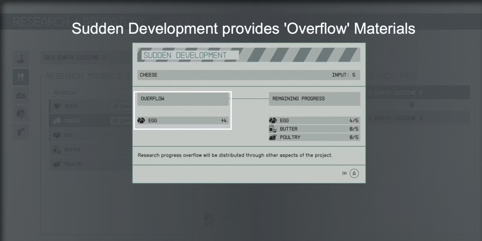 Для каждого исследовательского проекта требуется определенный "рецепт", состоящий из различных материалов, которые игрок может найти в мире. Требования к материалам будут четко указаны справа от соответствующего проекта. Когда игроки начинают заполнять эти материалы, может произойти "Внезапное развитие". Эта механика случайным образом добавляет в проект "лишние" материалы, восполняя частично или полностью необходимый материал.
