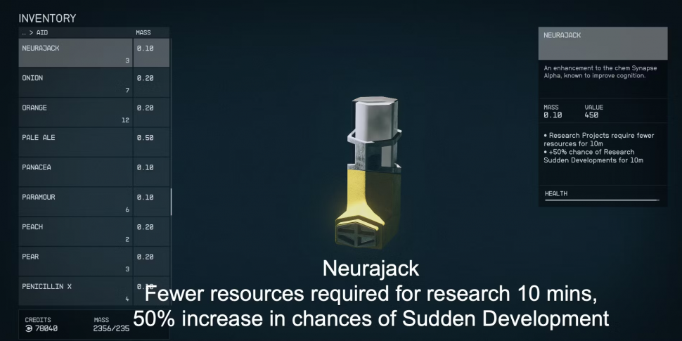 Существует два предмета химии, с помощью которых игроки могут влиять на обе эти механики. Synapse Alpha снижает требования к материалам для всех исследовательских проектов на 10 минут. Neurajack делает то же самое, но увеличивает вероятность внезапного развития на 50% в течение тех же десяти минут.