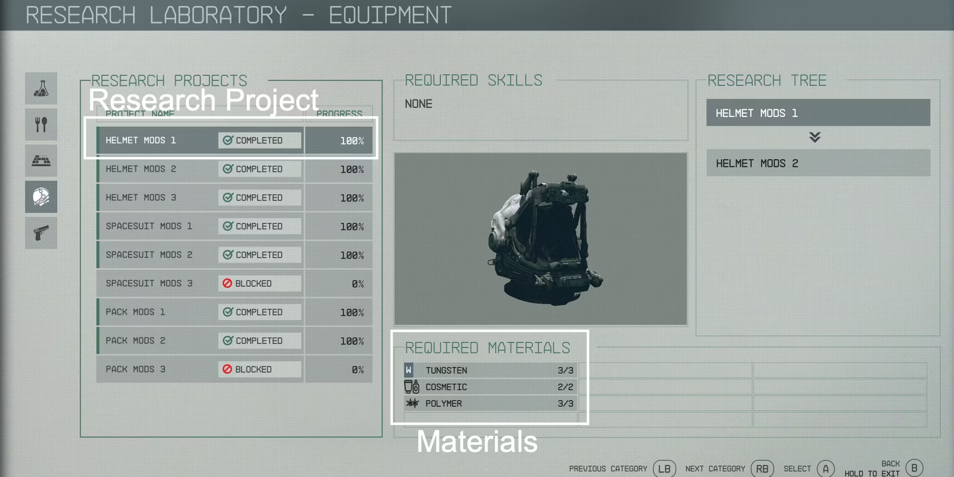 В каждой из пяти категорий есть выбор проектов, которые доступны с самого начала игры. Например, завершив проект Helmet Mods 1 в категории Equipment, игрок сможет создавать все моды, связанные с этим проектом, на верстаке Spacesuit Workbench.