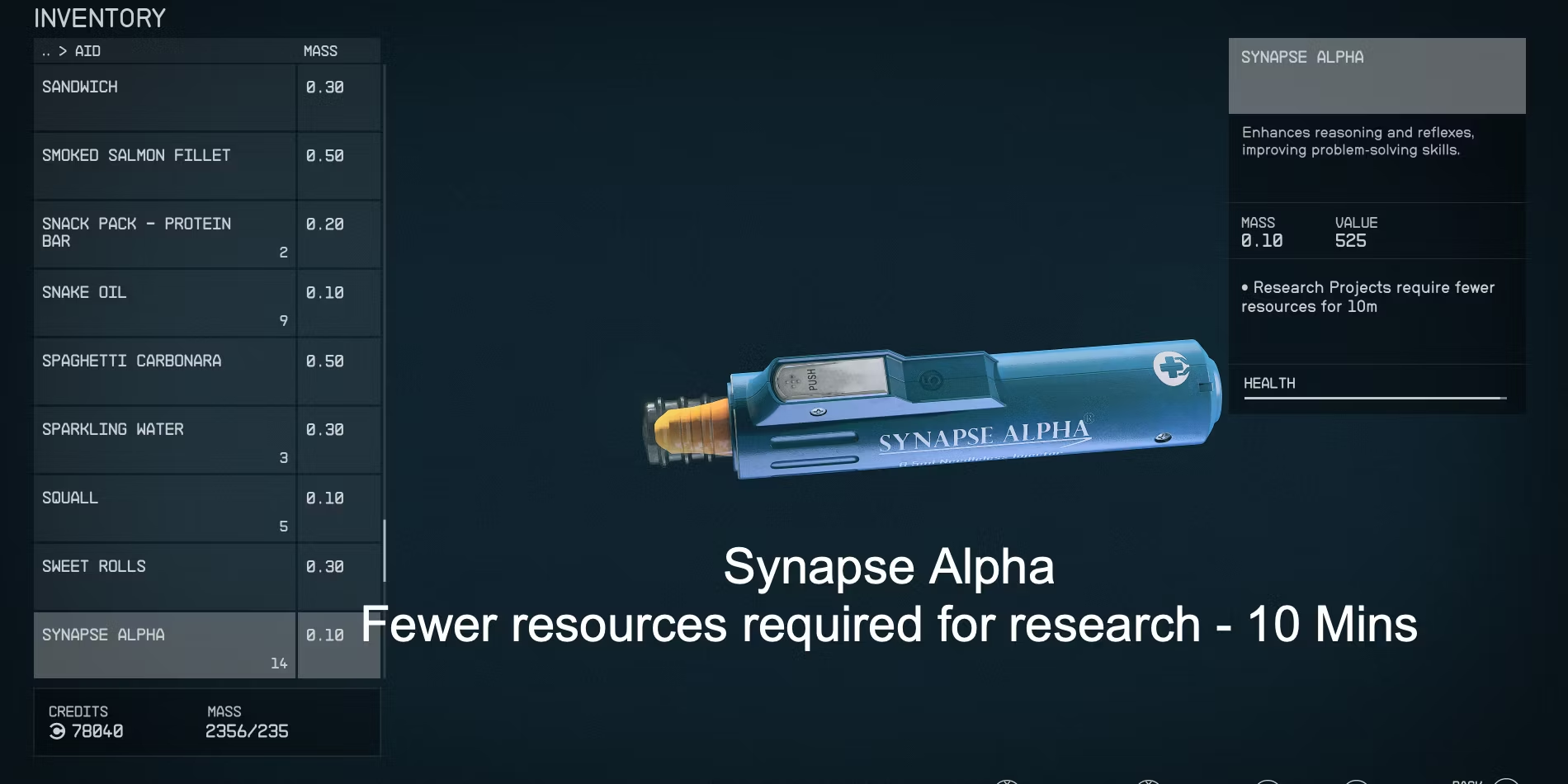 Существует два предмета химии, с помощью которых игроки могут влиять на обе эти механики. Synapse Alpha снижает требования к материалам для всех исследовательских проектов на 10 минут. Neurajack делает то же самое, но увеличивает вероятность внезапного развития на 50% в течение тех же десяти минут.