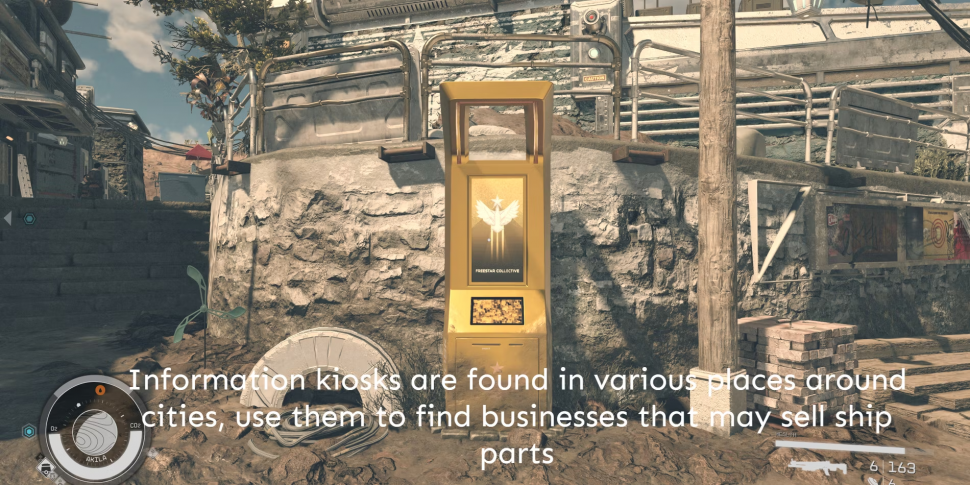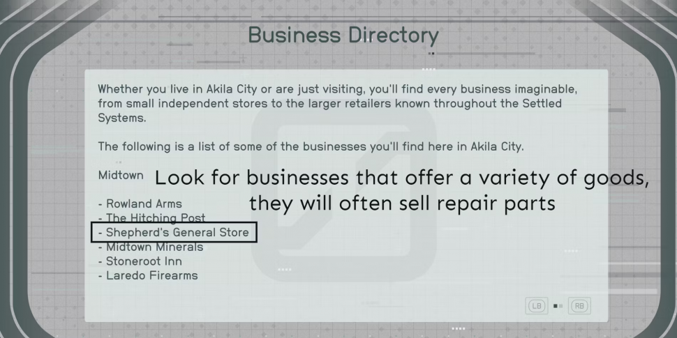 Еще одним важным инструментом для поиска торговцев в том или ином городе является информационный киоск, который можно найти в Акила-Сити сразу за магазином Shepherd's General Store. В этих информационных киосках размещается информация о важных местах в каждом городе, в том числе и о предприятиях. Магазины, предлагающие широкий выбор, имеют наибольшие шансы иметь в наличии запчасти для кораблей.