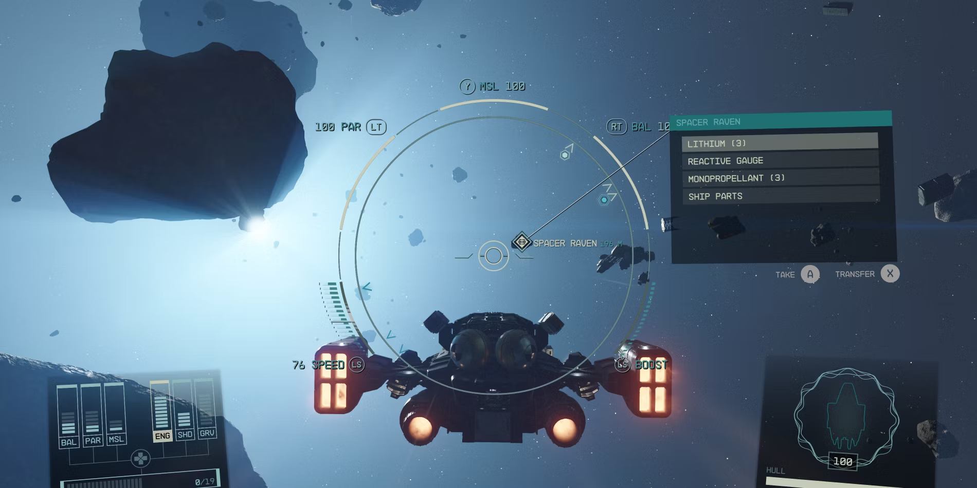 Если корабль получил повреждения во время боя, HUD немедленно сообщит об этом игроку. Когда это произойдет, нажмите кнопку RS, чтобы использовать все доступные части корабля. Они действуют аналогично медпаку, постепенно восстанавливая корпус корабля.