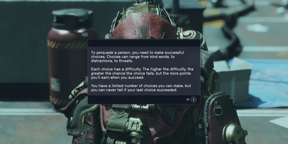 Важно отметить, что попытки убеждения в Starfield случайны, по крайней мере, в некоторой степени, то есть не существует правильных или неправильных ответов. Вероятность успеха одних ответов выше, чем других, и есть вещи, которые игрок может сделать, чтобы увеличить свои шансы на успех. Однако в конечном итоге каждый раз, когда игрок выбирает ответ, он фактически бросает кости. Поэтому единственным надежным способом гарантировать успех попытки убеждения является предварительное сохранение и последующая перезагрузка, если что-то пойдет не так.