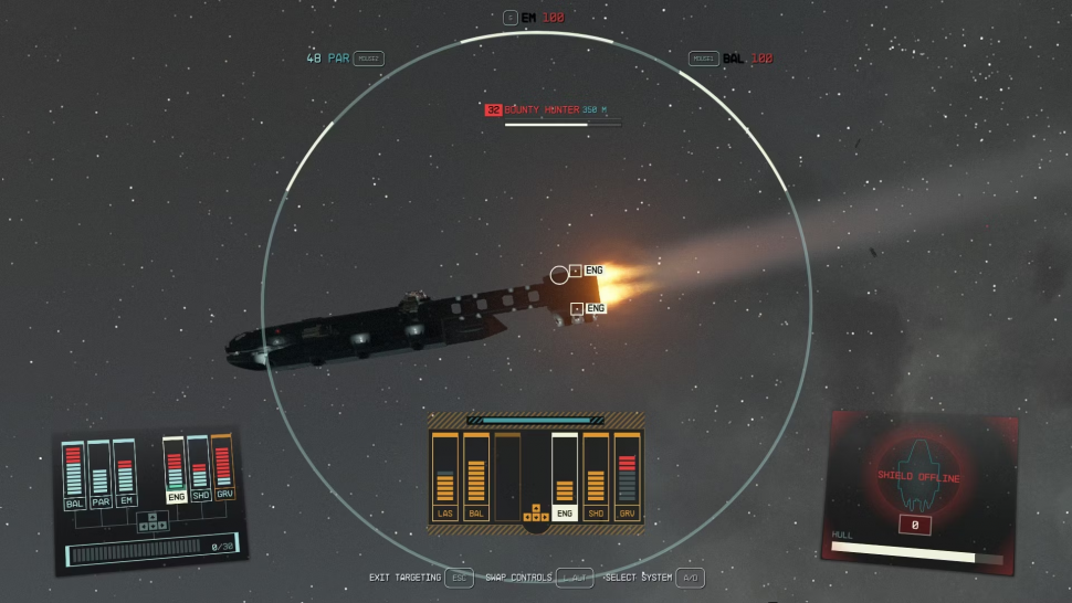 В самом начале игры игроков учат целиться в двигатели вражеского корабля, чтобы обездвижить его. Это сопряжено с риском уничтожения корабля, что не позволит игрокам взять его на абордаж. Нелетальная альтернатива этому - обстрел кораблей из ЭМ-оружия (например, Disruptor 3300 Electron Beam), которое специально разработано для нанесения большего урона системам корабля в режиме прицеливания.