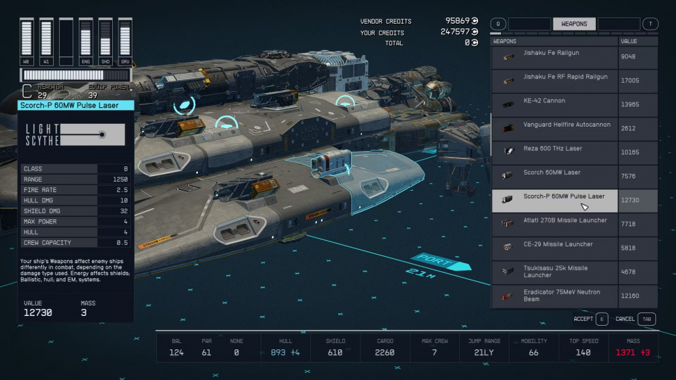 Что касается баллистического и лазерного оружия, то пушка KE-42 (31 DMG корпуса, 2,5 скорострельности) и 60-мегаваттный импульсный лазер Scorch-P (32 DMG щита, 2,5 скорострельности) - отличные варианты для кораблей класса B. Пилоты, желающие использовать гибридные системы вооружения, могут многое почерпнуть из этой комбинации, поскольку они решают задачи как по разрушению щитов, так и по разрушению корпусов любого боеспособного крейсера.