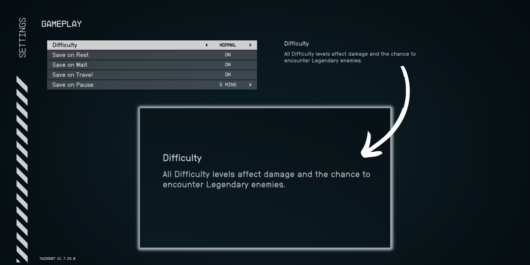 Starfield имеет пять уровней сложности: Очень легкий, Легкий, Нормальный, Тяжелый и Очень тяжелый. Хотя эти настройки не влияют на сюжет, они изменяют количество наносимого и получаемого урона, а также частоту встреч с легендарными врагами. По сути, при выборе "легкого" варианта уменьшается получаемый урон и снижается количество встреч с легендарными врагами, а при выборе "тяжелого" - наоборот.