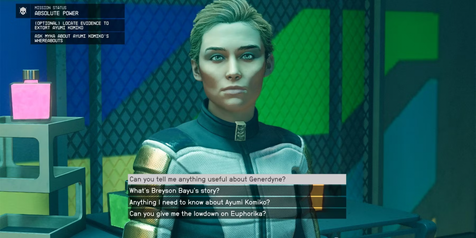 Теперь следуйте по второму квестовому маркеру в Эвфорику и поговорите с Микой. Как только речь заходит об Аюми, она становится крайне агрессивной, и единственным способом прорваться к ней будет либо раскрытие связей с Crimson Fleet, либо уплата некоторого количества Кредитов. Далее отправляйтесь в зал заседаний, используя ключ доступа, чтобы найти единственную и неповторимую Аюми Комико.