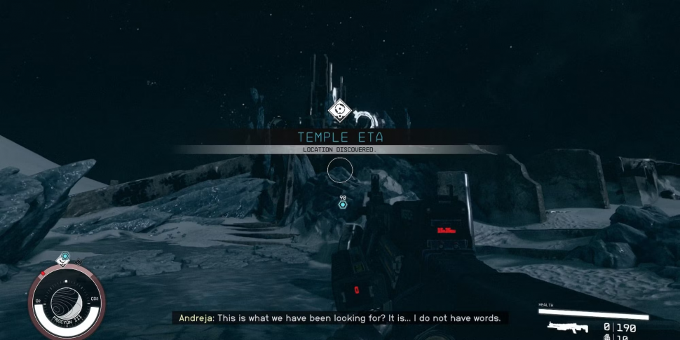 После приземления на заданную планету вызовите сканер и начните осматриваться. Игроки заметят, что HUD начнет жужжать и волноваться, когда они повернутся лицом в определенную сторону. Когда это произойдет, начните бежать в указанном направлении, и в конце концов станет видна большая кристаллическая структура с соответствующим квестовым маркером. Следуйте по маркеру к одной из дверей сооружения, чтобы войти в Храм Эта.