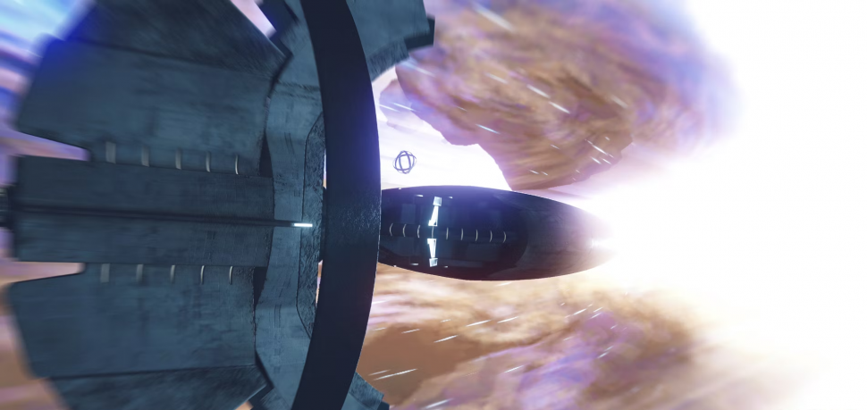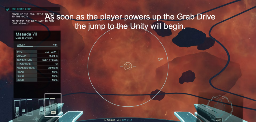 В тот момент, когда игроки включат гравипривод, начнется прыжок на Unity. Во время этого длительного перемещения в пространстве. На вершине корабля отчетливо виден Армиллар, который ведет игрока к месту назначения. По прибытии игроков ожидает знакомое лицо.