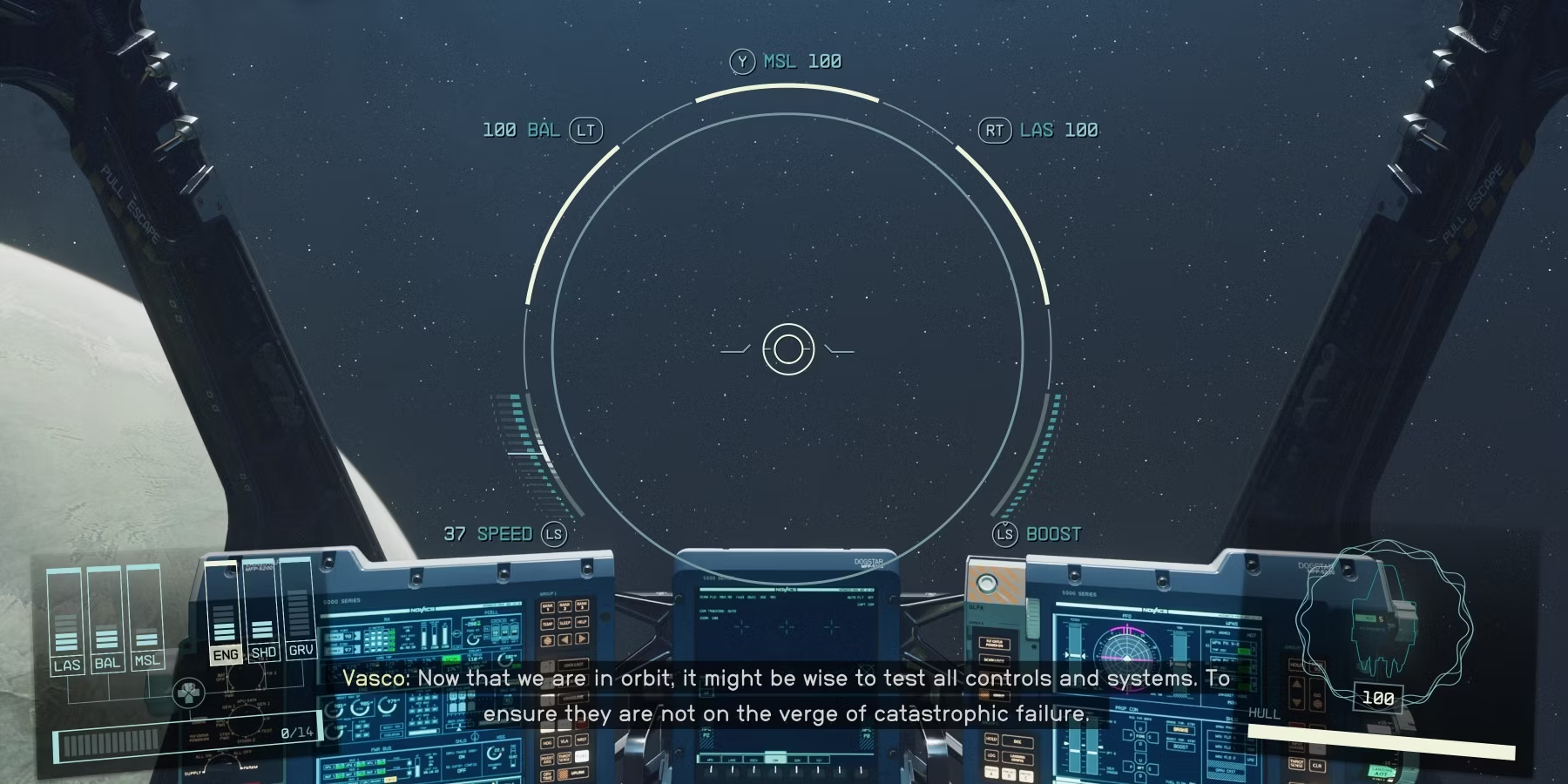 Вскоре после выхода в открытый космос игроки получат полное руководство по управлению космическим кораблем и питанию различных систем на борту. Обучение можно пропустить, распределив питание по всем системам. После базового обучения игроки получат первый опыт ведения космического боя. Все элементы управления оружием перечислены в верхней части пользовательского интерфейса, поэтому игрок всегда будет знать, какую кнопку/клавишу нужно нажать, чтобы использовать оружие.