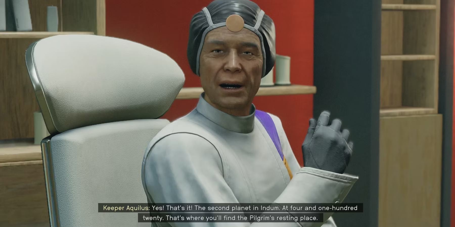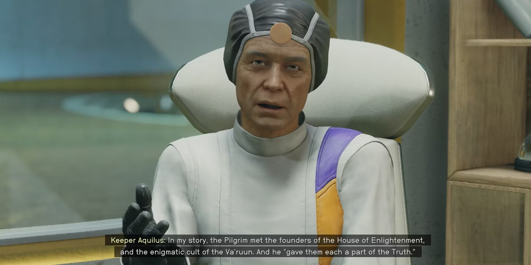 Направляйтесь на запад от Ложи к Санктум Универсум, где Маттео встретится с Хранителем Аквилусом. Узнав о цели внезапного визита, тот приглашает игроков внутрь, где рассказывает им старую историю о путешествии пилигрима с основателями Ва'руна и Дома Просвещения. Хранитель Аквилус считает, что эта история - код, ведущий к месту упокоения Пилигрима, в котором содержится ответ на вопрос "Единство". Чтобы найти ответ, Протагонист должен поговорить с двумя персонажами в Starfield.