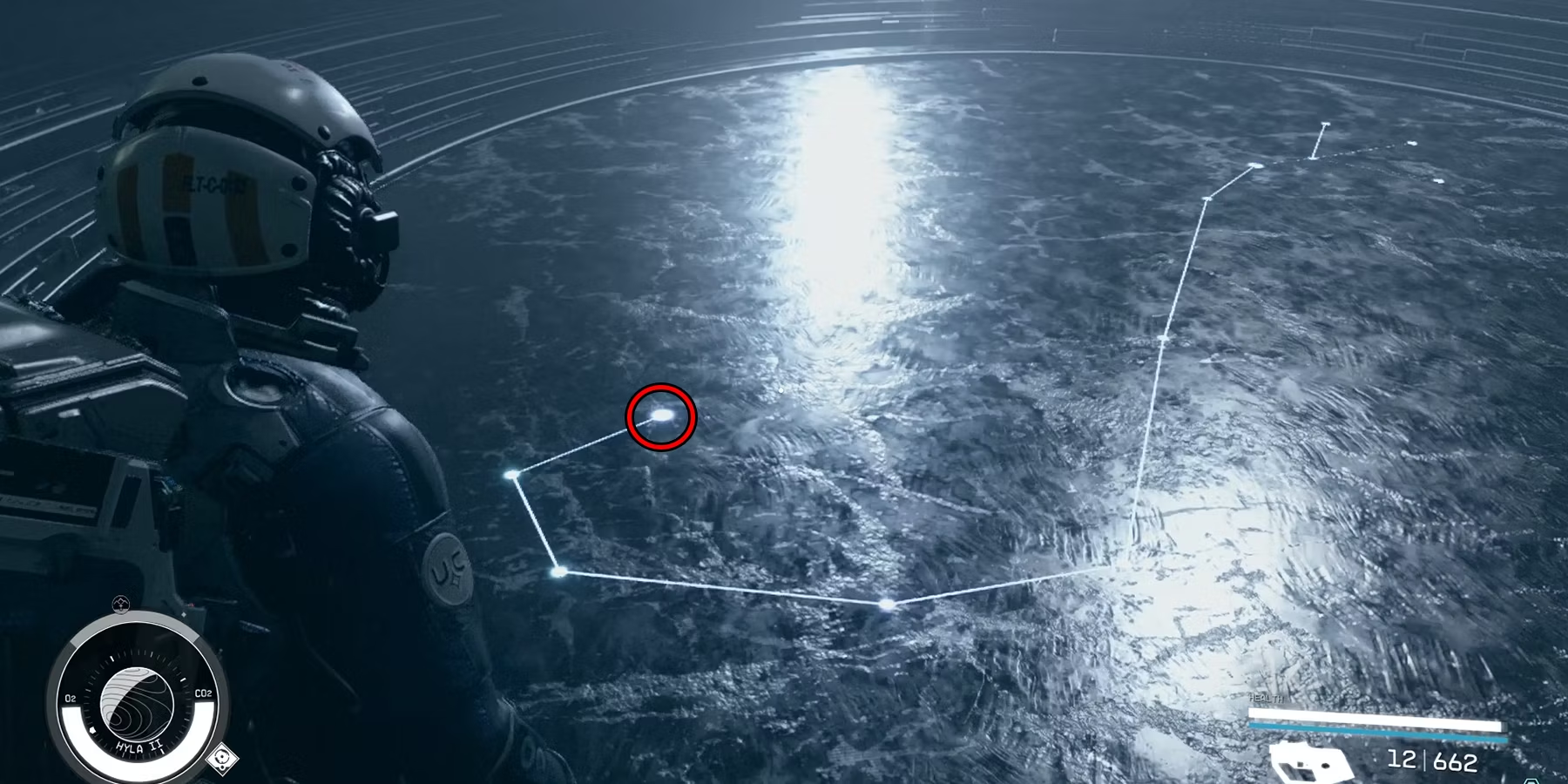 Зайдите внутрь и возьмите "Последнее письмо пилигрима", чтобы найти ответ. Вернитесь на корабль в Starfield и совершите прыжок в систему Hyla, чтобы приземлиться на Hyla II.