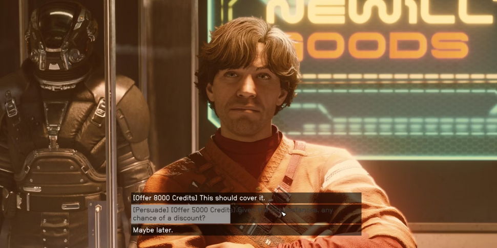 Необязательное, но вполне выполнимое задание - забрать партию доспехов из магазина Newill's Goods на рынке Икути. Торговец будет настойчиво торговаться, предлагая за броню 8 000 кредитов, но его можно убедить снизить цену до 5 000, если игрок обладает достаточными социальными навыками.