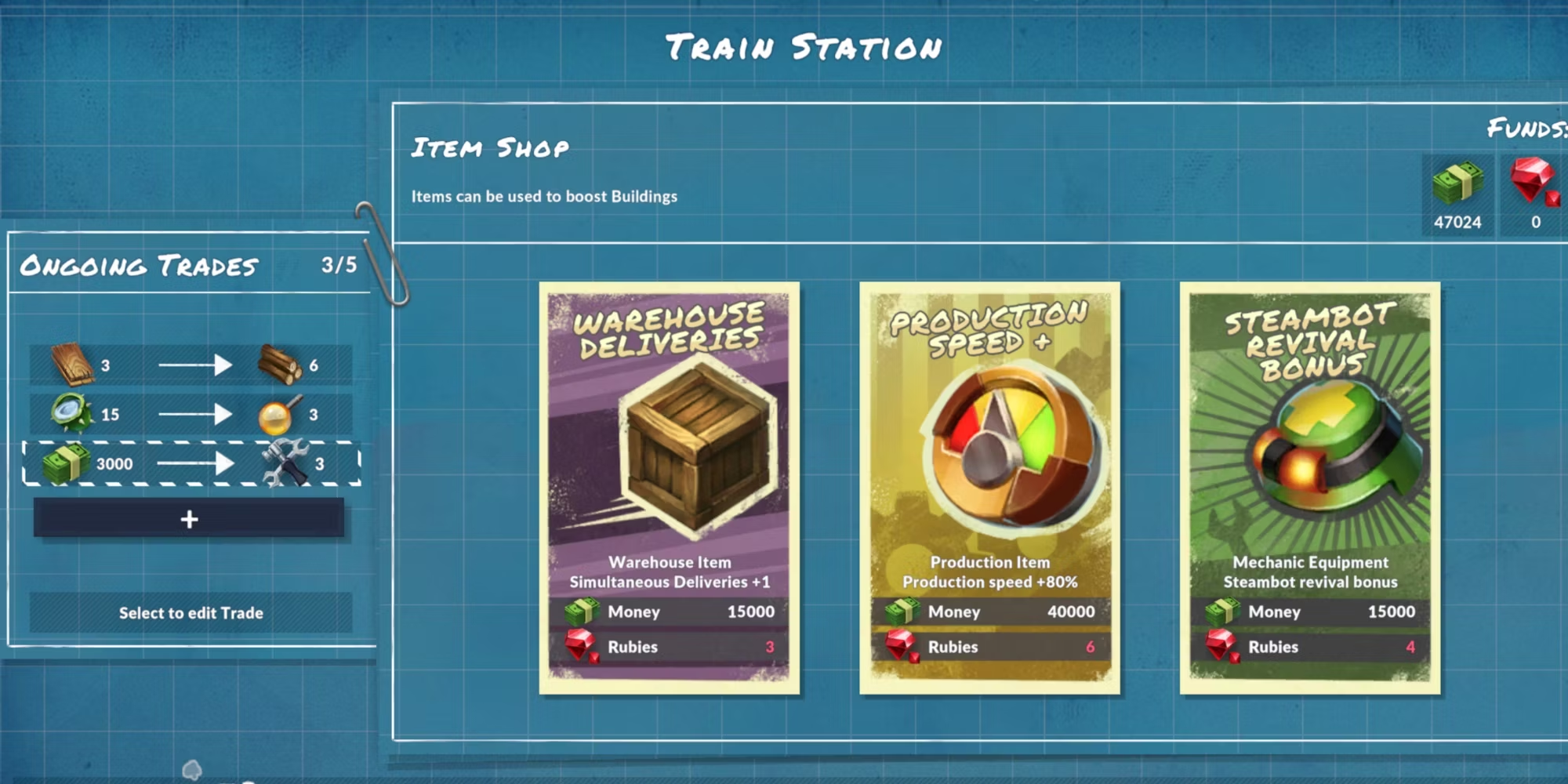 Кроме того, геймеры могут приобретать инструменты пассивно. Если у игрока есть свободные ресурсы, он может подумать о том, чтобы избавиться от их излишков, заключив сделку на железнодорожной станции. Игроки могут заключить сделку, в которой они отдают ресурс или деньги в обмен на Инструменты. Затем, когда придет поезд, он отдаст им Инструменты и заберет предметы, которые они хотят вывезти. Одновременно можно вести пять сделок, и они будут повторяться каждый раз, когда придет поезд. Геймеры могут отменить или изменить эти сделки в любое время.