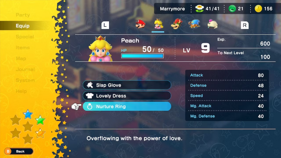 Чтобы использовать Кольцо воспитания, игрокам Super Mario RPG сначала нужно продвинуться достаточно далеко по сюжету, чтобы Пич стала играбельным персонажем в партии. В этот момент игроки смогут увидеть кольцо Nurture Ring в своем инвентаре и экипировать его на нее. Даже с экипированным кольцом поначалу будет казаться, что оно ничего не делает.