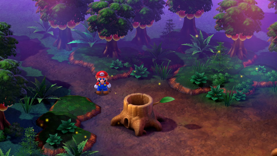 Игроки попадут на открытую поляну в лесу, заваленную пнями, которые ведут в отдельные пещеры. В каждой из них есть свои враги и спрятанные сокровища, но чтобы пройти дальше в лес, Марио нужно войти в пень, расположенный в северо-западной части поляны.