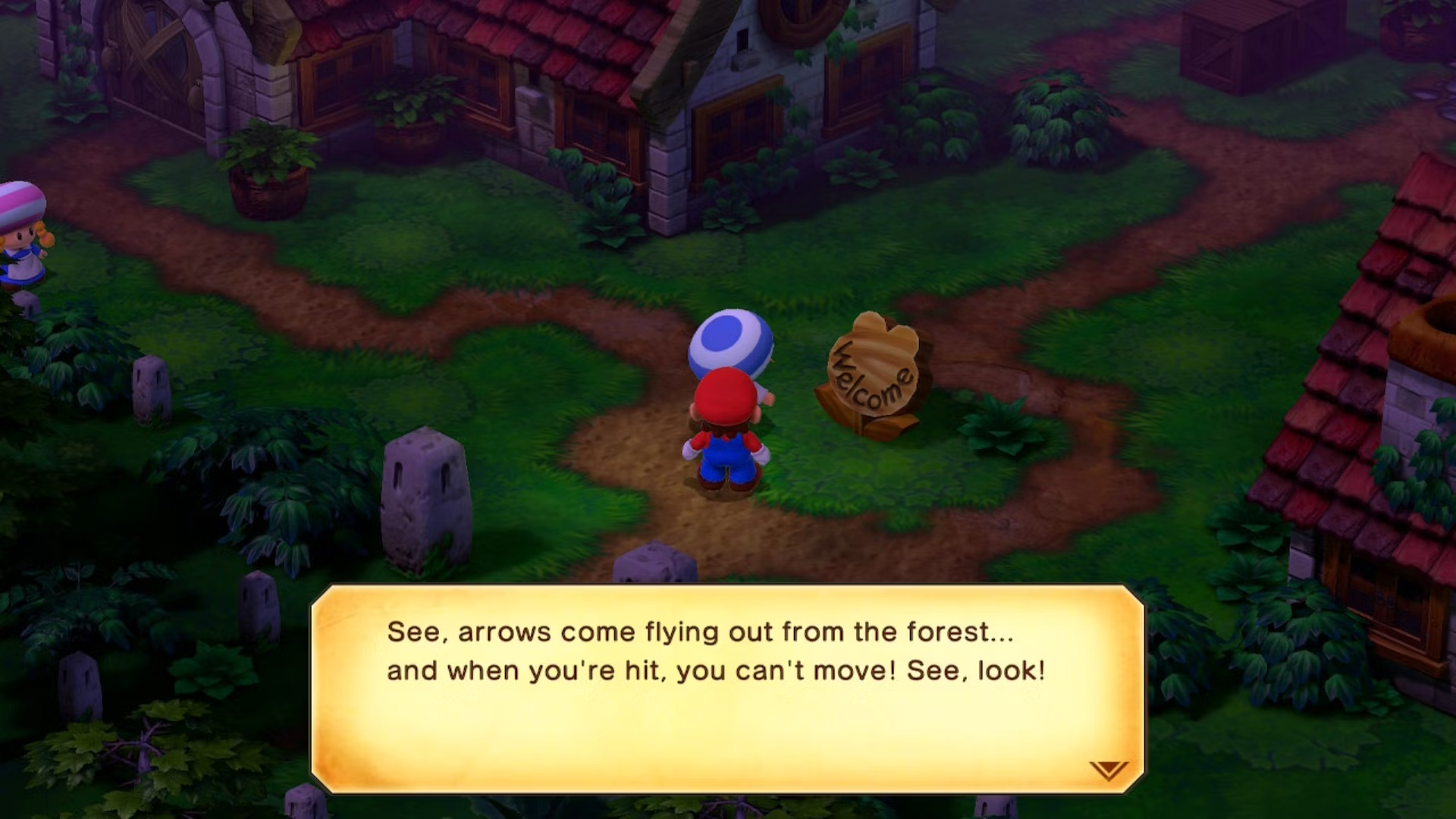 В Super Mario RPG первая часть леса довольно линейна. Продвижение вглубь лесного лабиринта осуществляется через пень, который работает как зеленая труба, ведущая в пещеру, расположенную внизу. Как только игрок попадает на другую сторону, начинается хаос: новые враги в изобилии, а с неба сыплются стрелы, которые замораживают Марио на месте.