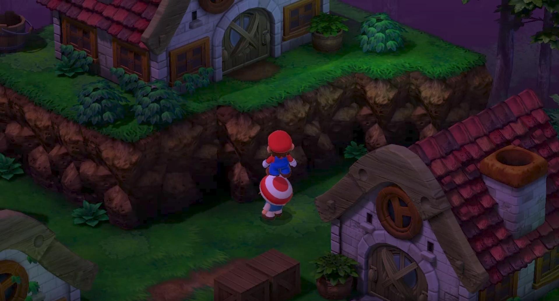 Дом жабы стоит на вершине небольшого холма в северо-западной части Роуз-Тауна. И хотя он просит Марио использовать свои отличные прыжки, чтобы добраться до него и активировать лестницу внутри, высота оказывается слишком большой с уровня земли. Как показано на скрине выше, чтобы добраться до дома, игроку придется сначала запрыгнуть на голову Тоада. Внутри можно найти сына Тоада, а также переключатель для лестницы.