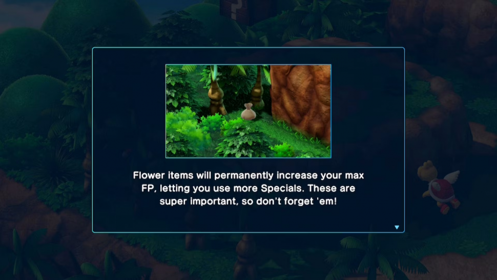 Игроки должны быть начеку и собирать как можно больше цветочных предметов, чтобы увеличить FP и облегчить сражения с помощью более частых специальных движений.