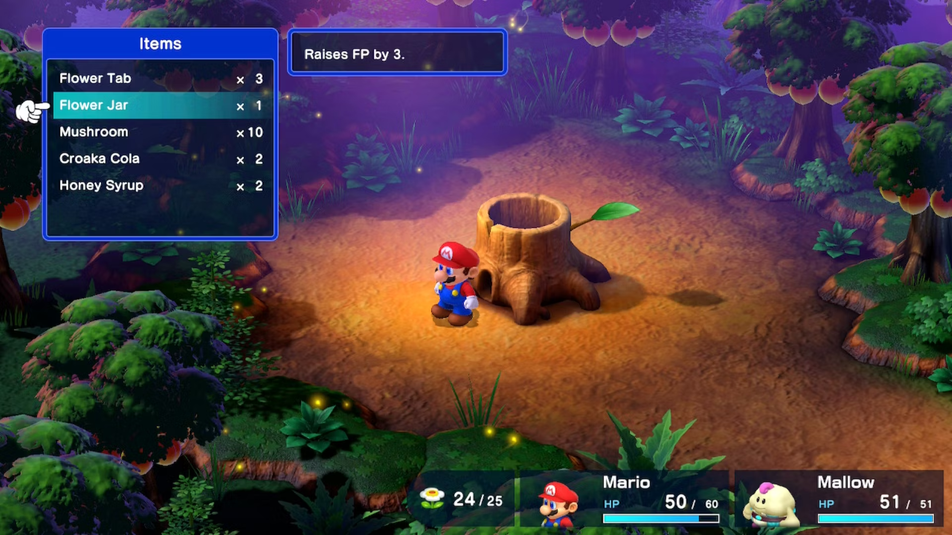 Игроки должны быть начеку и собирать как можно больше цветочных предметов, чтобы увеличить FP и облегчить сражения с помощью более частых специальных движений.