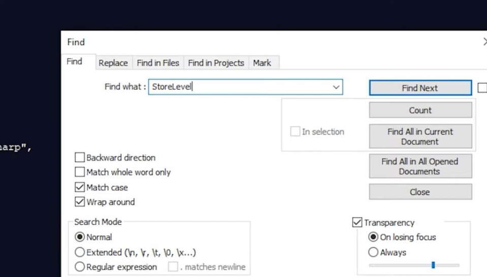 Затем нажмите на клавиатуре клавиши Ctrl + F, чтобы открыть окно поиска Find. Вы также можете щелкнуть на Edit и выбрать Find, чтобы сделать это. В любом случае введите StoreLevel и нажмите Enter.
