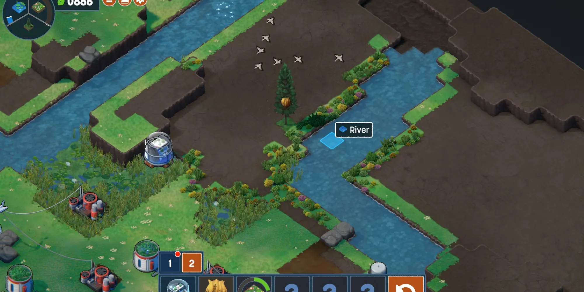 На первом этапе необходимо восстановить зеленые насаждения. На этапе "Речная долина" это довольно просто. Сначала нужно установить турбины, но они могут быть расположены только на камнях. Уровни генерируются процедурно, поэтому, если игрокам не повезло с равномерным распределением камней, они могут использовать кальцификатор для создания новых камней из воды, чтобы добраться до этих бесплодных мест.