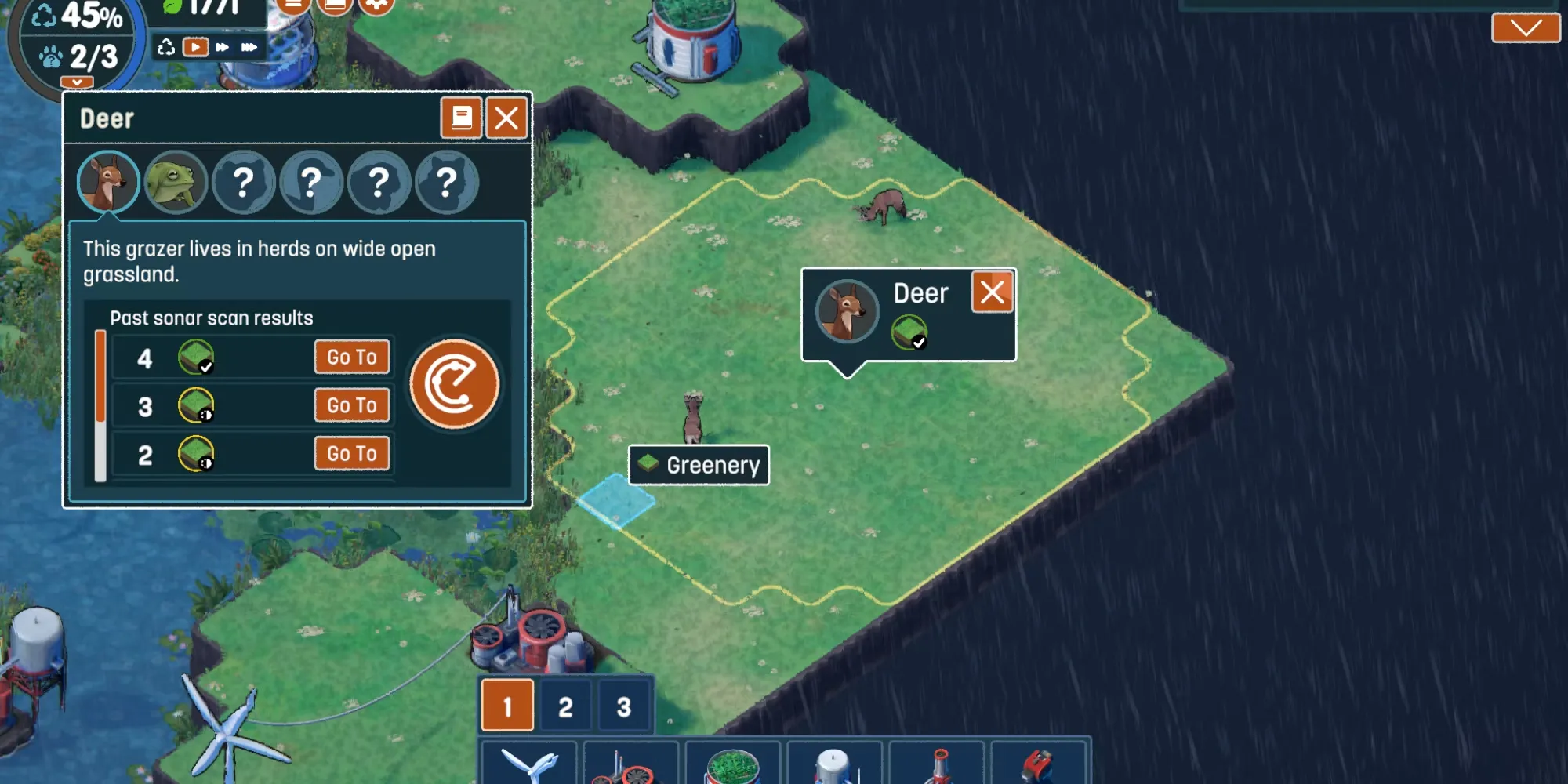 Карта не обязательно должна быть полностью покрыта зеленью, чтобы перейти на следующий этап, но это поможет получить равномерное распределение озелененных земель для последующего преобразования. Игроки могут отслеживать свой прогресс в верхней левой части экрана. Как только процент достигнет 100, настанет время увеличить биоразнообразие!