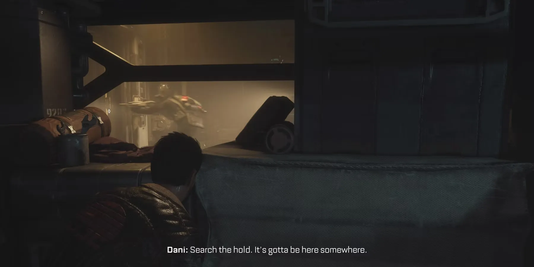 Проходя через грузовой отсек, скрытый ящиками и полками, игроки увидят террористов Outer Way, перемещающихся по коридорам корабля. К счастью, это всего лишь заскриптованная сцена. Так что игрокам Callisto Protocol пока не придется беспокоиться о том, что им придется пробираться мимо врагов или гротескных монстров.