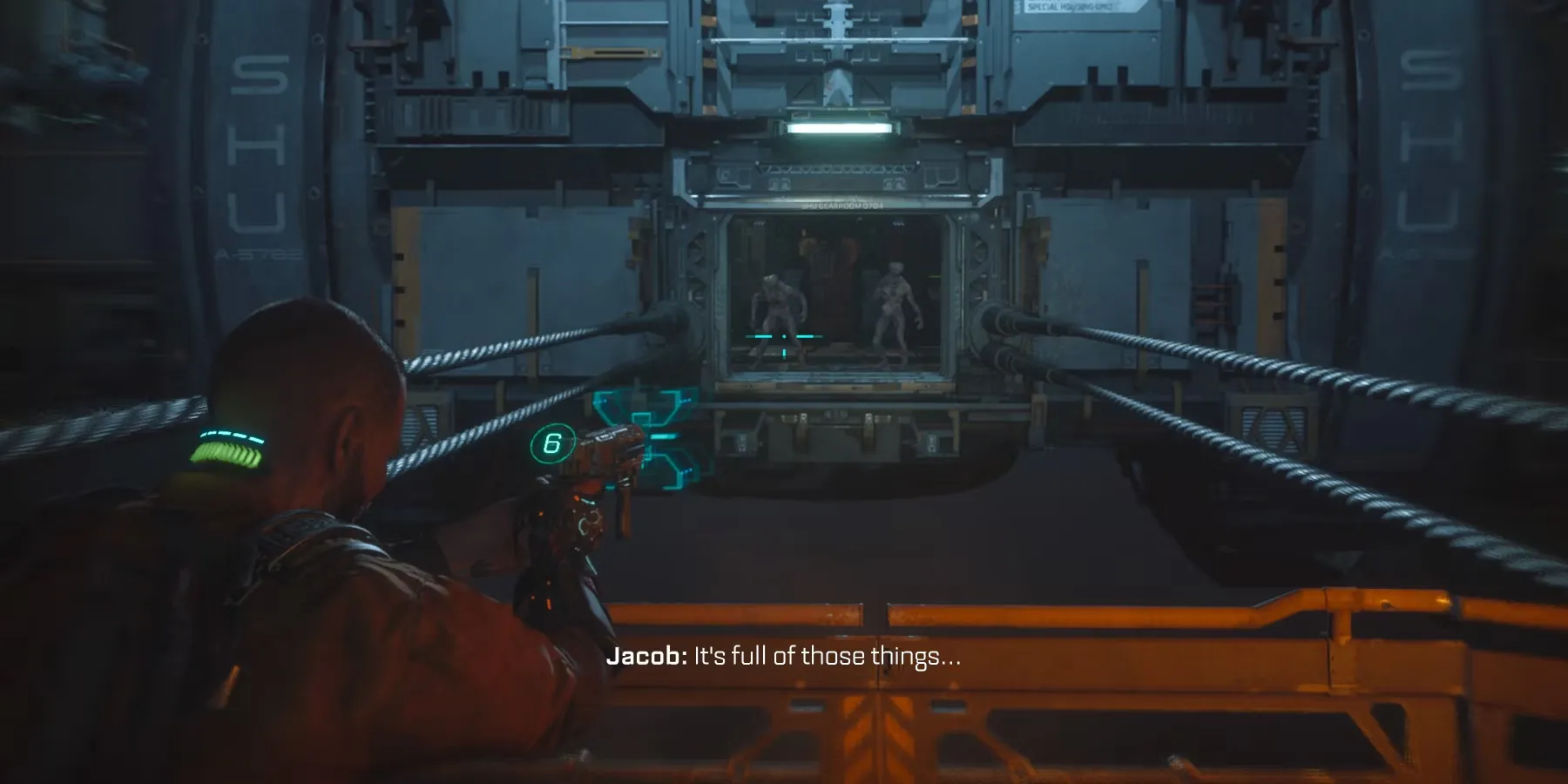 Когда гондола движется к SHU, двери откроются, и два биофага начнут атаковать снарядами. Либо уклоняйтесь от снарядов, либо убивайте биофагов с расстояния из ручной пушки. Оказавшись внутри SHU, убейте остальных биофагов и возьмите предохранители на другой стороне комнаты. Рядом со входом в эту комнату есть ящики, по которым можно подняться на платформу, где находятся предохранители.