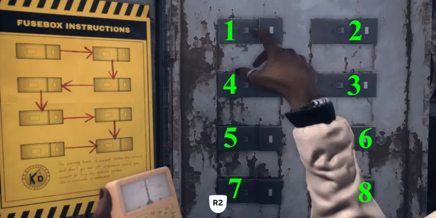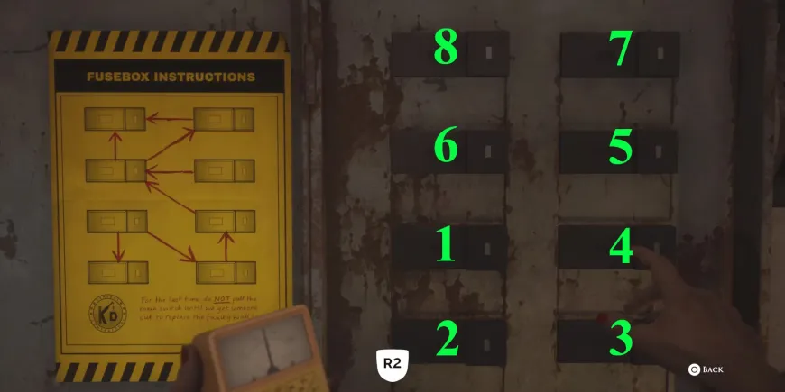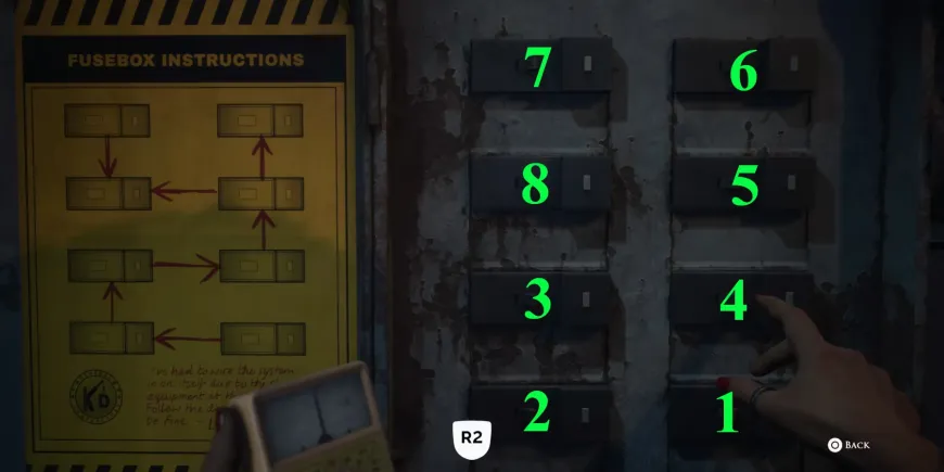 Первый блок предохранителей довольно прост, поскольку он знакомит игроков с новым видом головоломок. К блоку предохранителей будет прикреплена табличка, на которой будут описаны шаги по приведению древней проводки в рабочее состояние. При этом инструкции может быть трудновато прочитать. Вот в каком порядке их нужно нажимать: