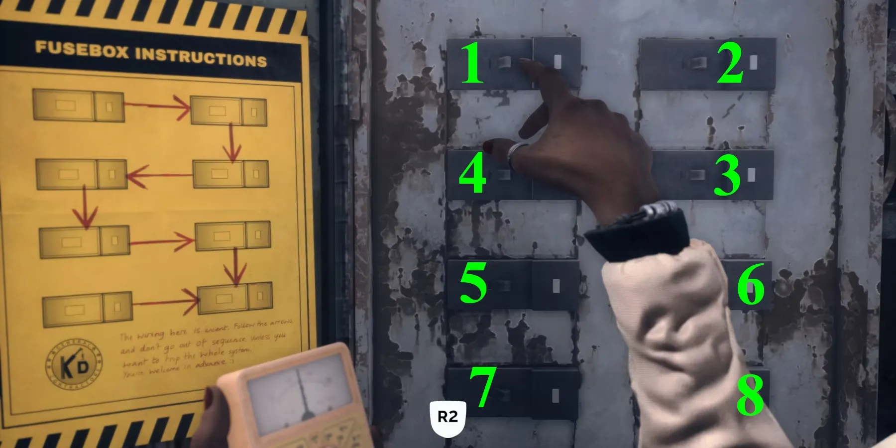 Первый блок предохранителей довольно прост, поскольку он знакомит игроков с новым видом головоломок. К блоку предохранителей будет прикреплена табличка, на которой будут описаны шаги по приведению древней проводки в рабочее состояние. При этом инструкции может быть трудновато прочитать. Вот в каком порядке их нужно нажимать: