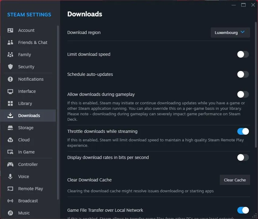 - В Steam перейдите в "Настройки", затем "Загрузки" и измените регион загрузки.