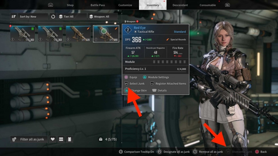 Вот здесь игрокам нужно быть предельно внимательными. Демонтаж оружия - это односторонний процесс, поэтому игрокам нужно быть предельно внимательными, чтобы не сломать мощное оружие, которое им необходимо. Чтобы разобрать его, игрокам нужно подвести курсор к оружию, которое они хотят сломать, а затем нажать R2/RT/J, чтобы пометить его как хлам. Когда оружие будет помечено как хлам, игроки смогут увидеть маленький оранжевый значок мусора в левом верхнем углу иконки оружия. Можно выбрать несколько видов оружия в качестве хлама. Кроме того, игроки могут отметить как хлам все предметы, находящиеся в данный момент на экране.
