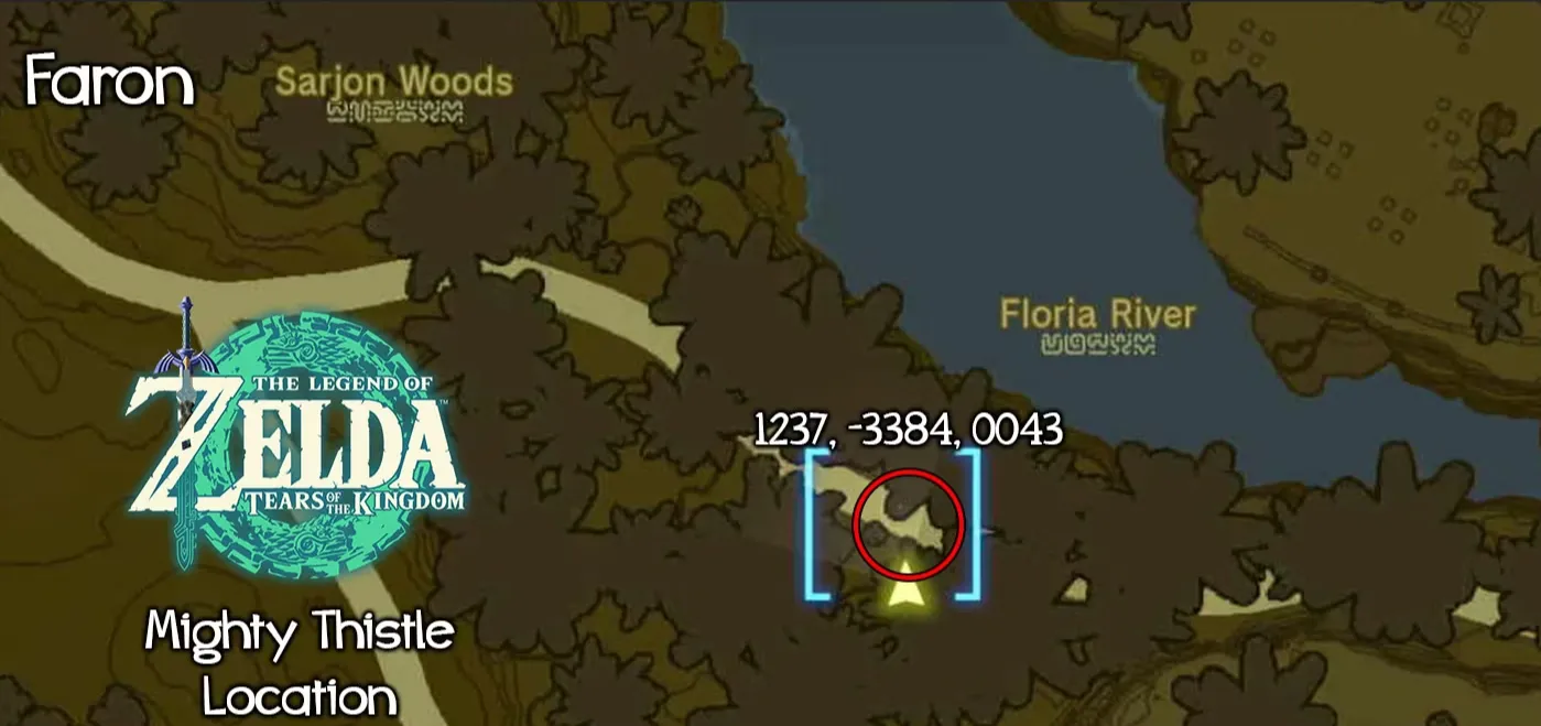 Небольшой участок Могучего чертополоха растет к югу от текста "Река Флория" на карте, по координатам 1237, -3384, 0043. Три растения можно найти вдоль дороги, по которой игрок может следовать на северо-запад, собирая их. Подумайте о завершении строительства близлежащего святилища Джоджу-у-у, чтобы получить точку быстрого перемещения в окрестностях.