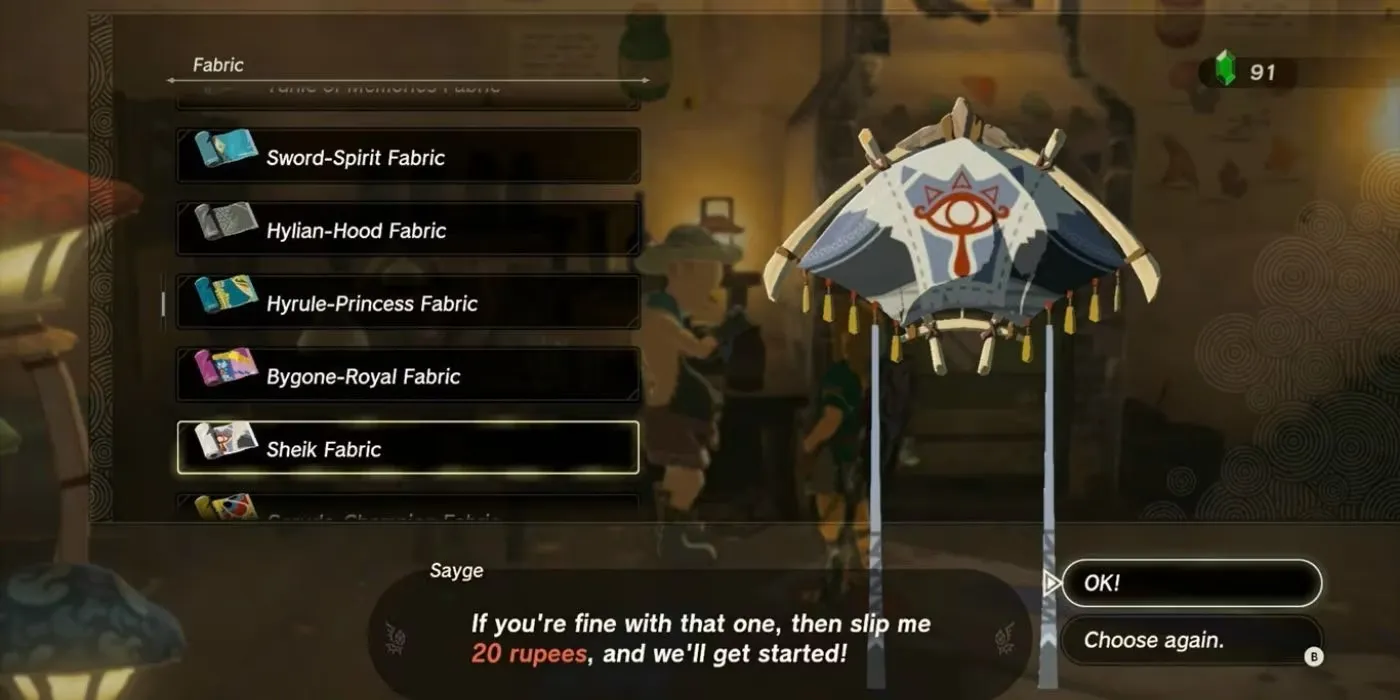 Чтобы просмотреть все доступные ткани, выберите "Переделать параплан". Выбрав нужную ткань, заплатите 20 рупий, чтобы завершить покупку. После этого игроки вылетят из дымохода магазина и смогут посмотреть на свою новую ткань для параплана.