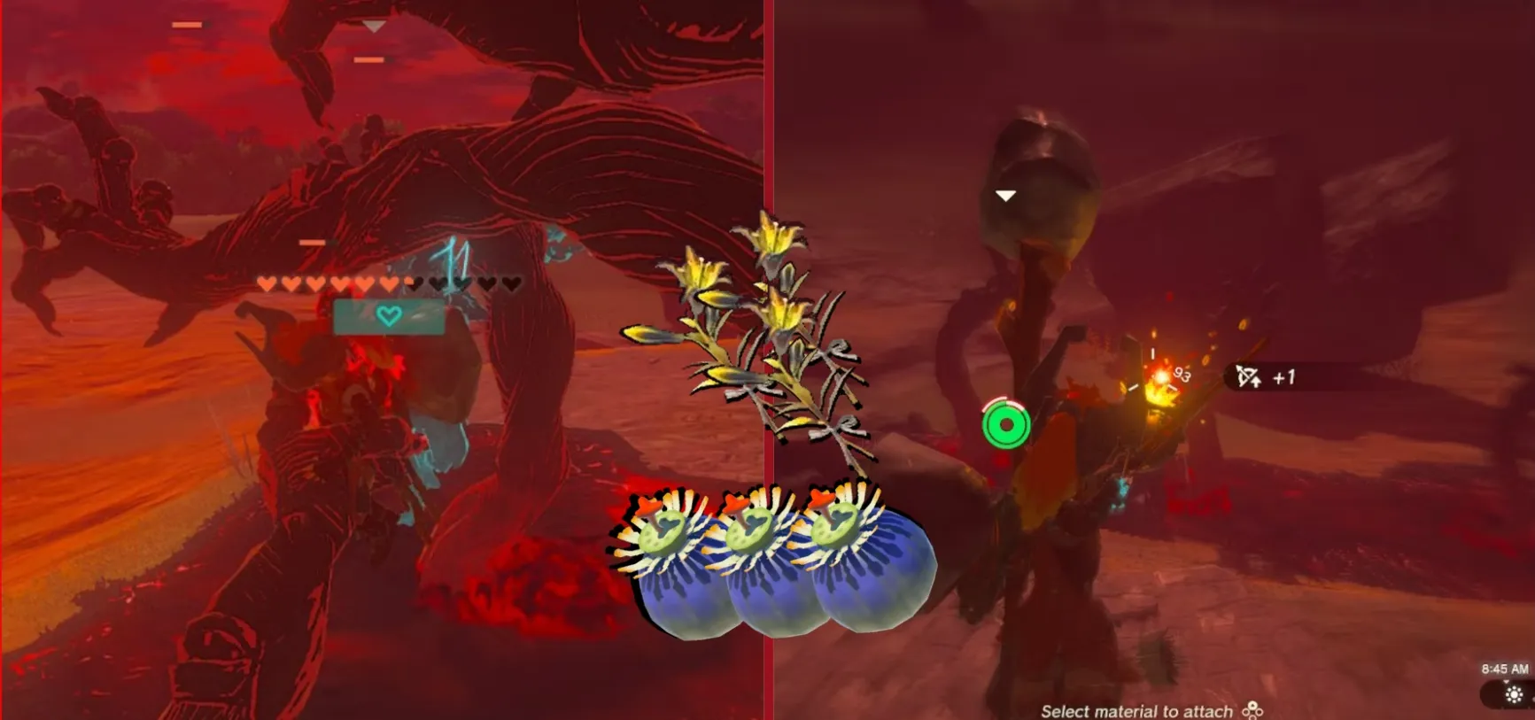 - Удерживая кнопку ZR, нажмите вверх на курсоре и прокрутите стиком R до цветка-бомбы или огненного фрукта.