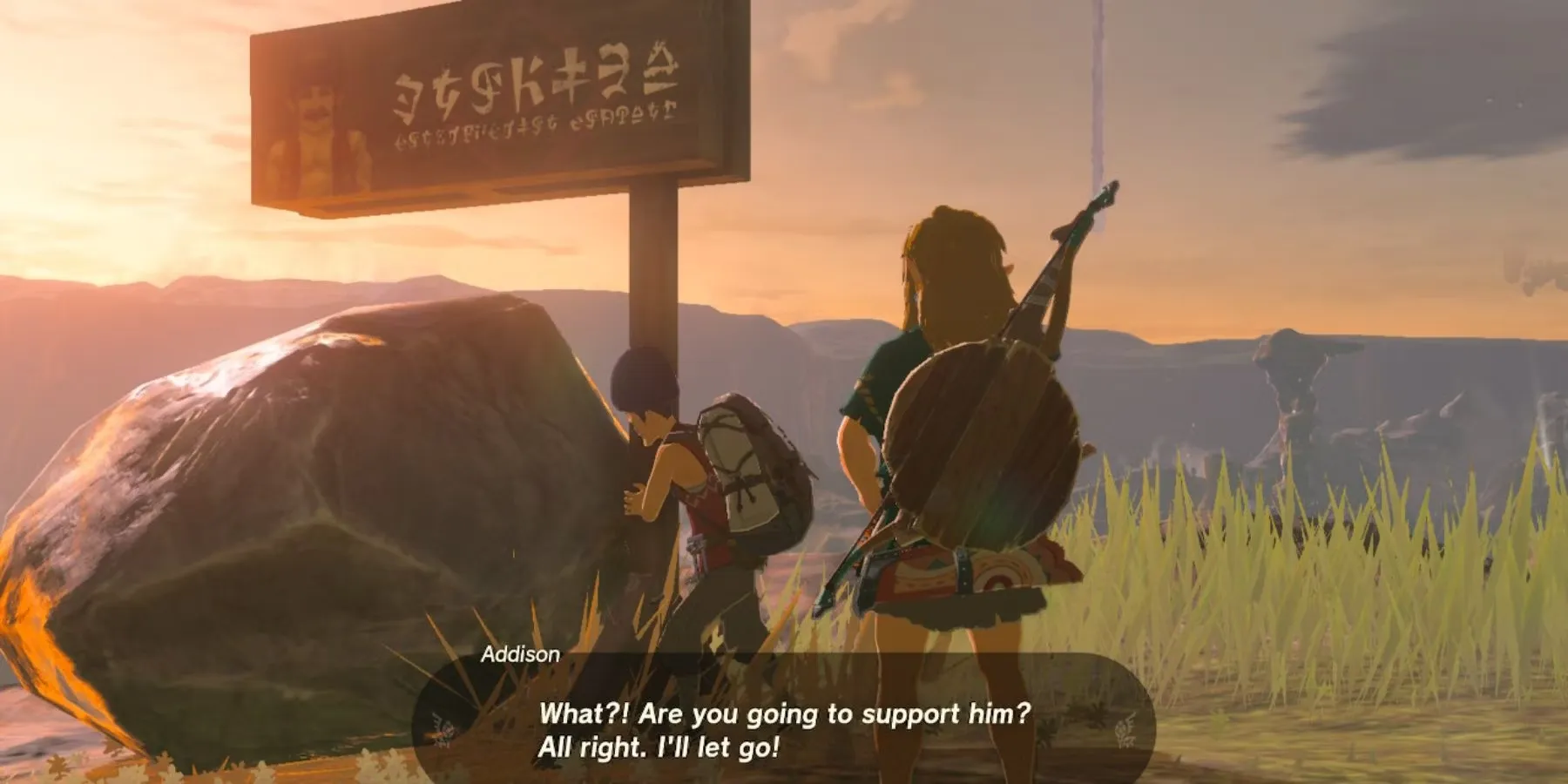 Игроки могут помочь починить знак, чтобы заработать рупии. Лучший способ починить его - использовать окружающую среду, например бревно, валуны или другие материалы, чтобы подпереть знак. Большие предметы можно перемещать с помощью способности "Сверхрука". Когда знак будет на что опереть, попросите Эддисона отпустить его, и если он останется на месте, он починит его и почти каждый раз будет награждать игроков рупиями.