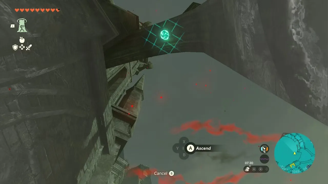 Оказавшись в тронном зале, игрокам нужно будет продолжить восхождение, поднимаясь по лестнице и проходя через мрак (при спринте Линк получит только 1/4 урона от сердца, преодолевая лестницу), используя силу Ascend, чтобы подняться вверх и оказаться на вершине тронного зала.