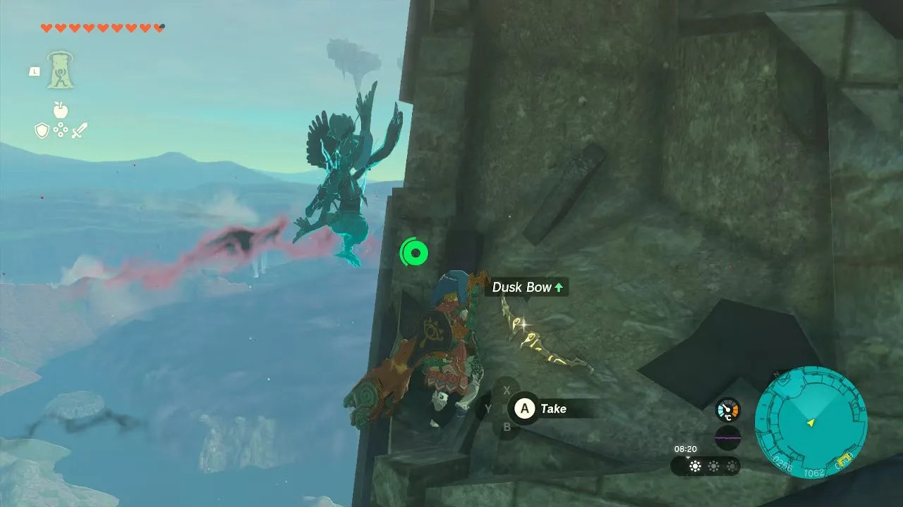 Отсюда продолжайте двигаться вверх, используя Ascend и навыки скалолазания Линка, чтобы подняться на колокольню замка. Недалеко от вершины шпиля не хватает куска, и в этом углублении можно найти Сумеречный лук.